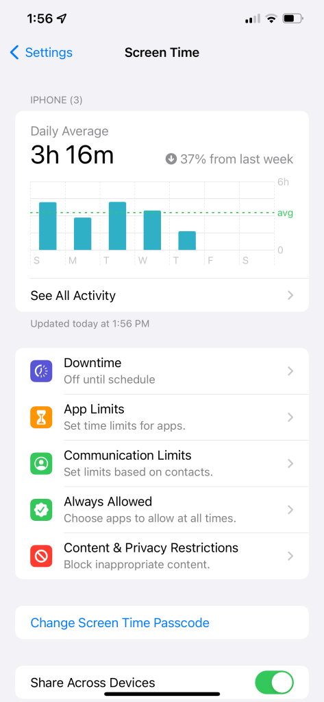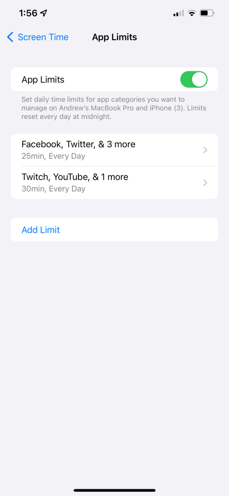 Let’s start with minimizing phone usage. For iPhone users, in settings, you can go to Screen Time then select App Limits. I have one limit for doomscroll apps like Twitter and TikTok, and one primarily for YouTube.