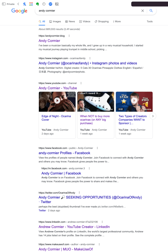 Google “Andy Cormier.” Use an incognito window so your search history of watching me doesn’t influence it. I will almost guarantee you that the very first result is my website, andycormier.blog. This is incredibly useful. What if a potential employer is looking me up? What if there’s another schmuck named Andy Cormier, and they can’t find me?