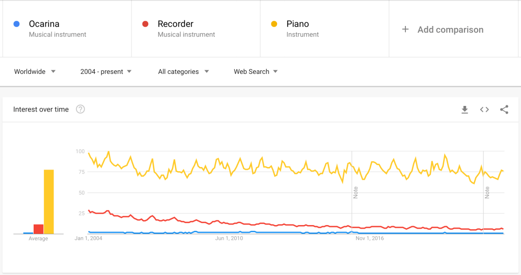 If we zoom out from 2004, you’ll see the recorder has gotten less popular, but the ocarina hasn’t gotten more popular either.