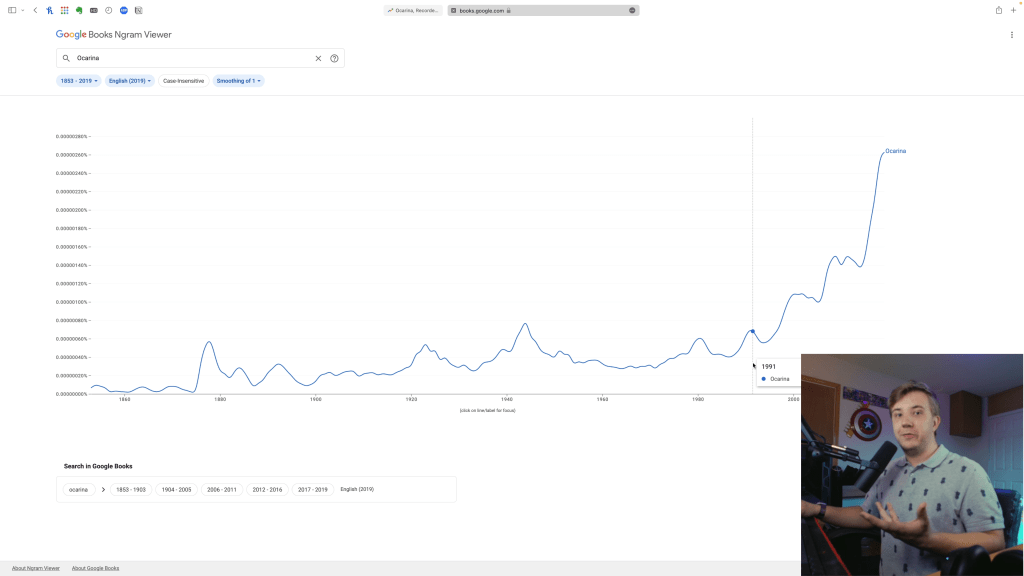 We don’t have as much specificity, since we only get data on the word “Ocarina,” so starting in the 90s, the data spikes upward because of ocarinas in media like Zelda: Ocarina of Time. But how did we get there?