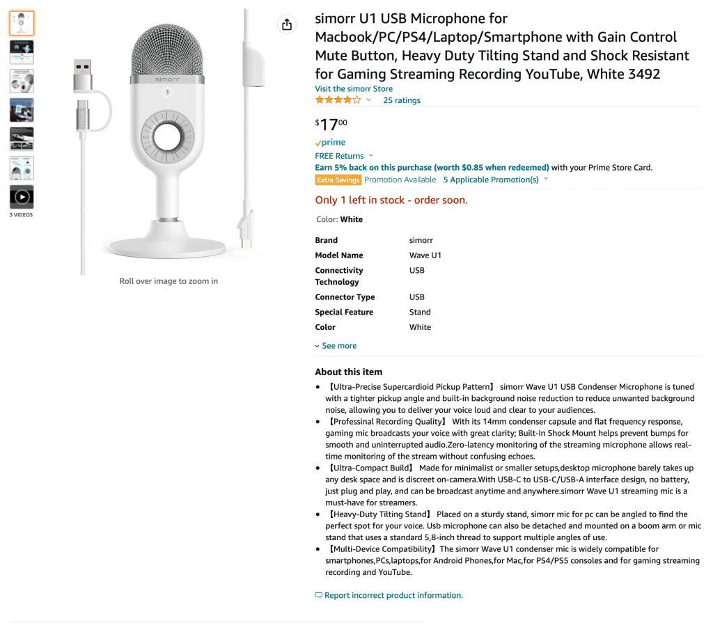 The simorr Wave U1 Mic is a USB condenser mic with a super cardioid pickup pattern, a 48kHz sample rate, and a 24bit dynamic range. It connects via USB C and has a headphone port on the cable for monitoring as well as a USB C to A converter for more plugging options. There’s also a dial for adjusting volume on the fly, and according to the Amazon listing, it also has a built-in shock mount. The company says it is “perfect” for streamers.