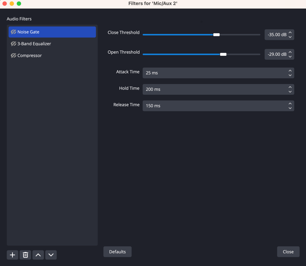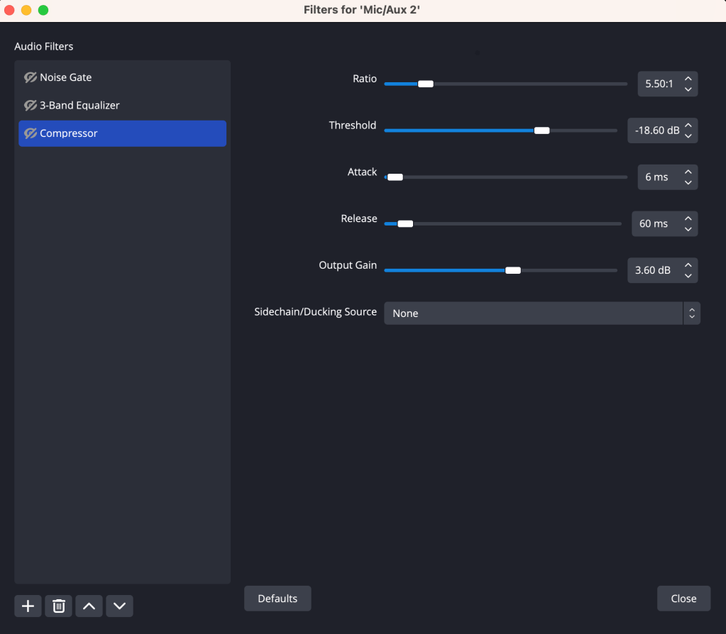 Sound-wise, it’s a bit muddy by default without EQ. I’m using OBS Studio’s built-in 3-band EQ filter to slightly lower bass, significantly lower mids, and raise highs to increase clarity and cut through the mud, but you’d get better results from a more advanced 10-20 band EQ setup. Given this is a cheap mic, I’m using beginner-level audio filters.